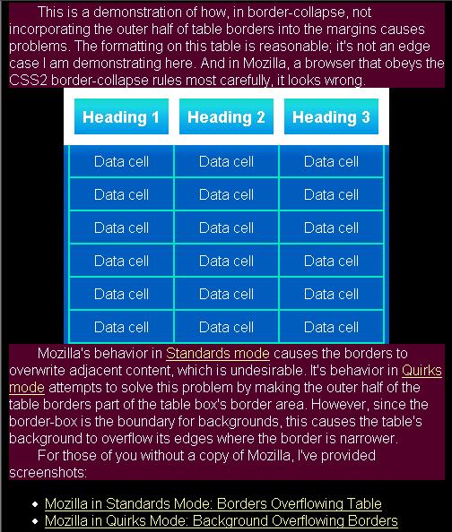 This is a demonstration of how, in border-collapse, not incorporating the outer half of table borders into the margins causes problems. The formatting on this table is reasonable; it's not an edge case I am demonstrating here, although I've thickened the borders to make the problems easier to see. (The problem would exist nonetheless.) In Mozilla, a browser that obeys the CSS2 border-collapse rules most carefully, it looks wrong.