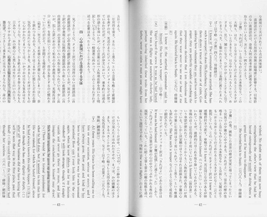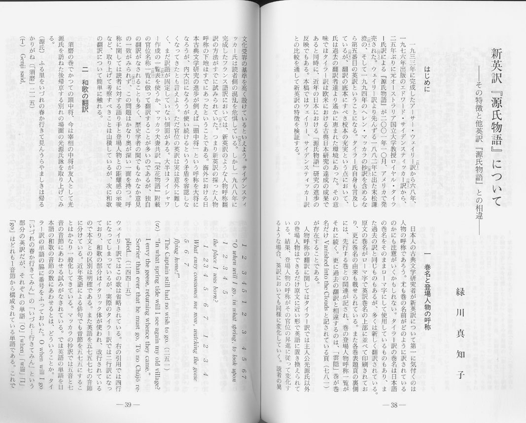 - Vertical-layout Japanese journal article apparently about English translations of the Tale of Genji. Sophisticated mixed English/Japanese typesetting including English paragraphs with Japanese notes, Japanese paragraphs with English quotes, underlines in both languages, ruby on English, syllable markings, Japanese-style citation (footnote) markings, and other fun things.