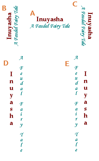 I decide, well, I'd rather have all the characters upright. So I apply "glyph-orientation-vertical: 0deg", which forces the Latin upright. Again, 'direction' is 'ltr', and all characters are L, so there is no reordering. I get [C], which isn't quite what I wanted [D]. I could apply a BIDI override, of course, to make 'direction' and all the characters go right-to-left. However, if the block progression doesn't stay left-to-right (which it won't in most browsers due to lack of support, or maybe a vagrant user stylesheet), I'll get [E], which is just useless.
